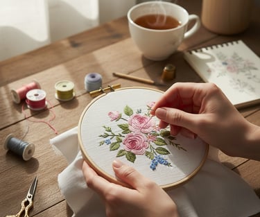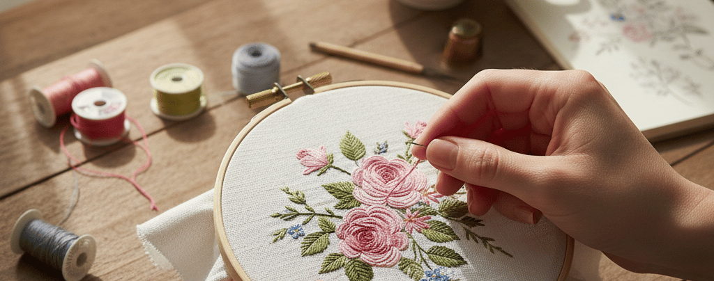Mais do que apenas decorar tecidos, o bordado é uma forma de desenhar com linhas. Ele permite personalizar roupas, criar quadros artísticos em bastidores e até mesmo consertar peças de um jeito criativo (o chamado sashiko ou visible mending). O ritmo calmo do vai-e-vem da agulha é considerado uma forma de meditação ativa, perfeita para desestressar.